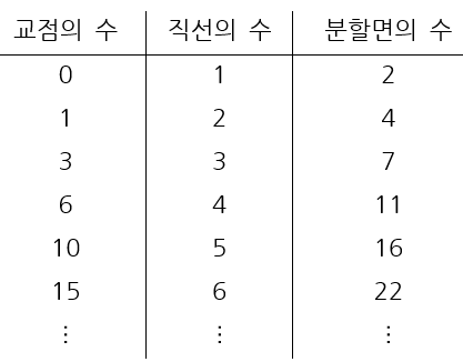 한 발짝 더, 이렇게 하다 보니, 직선이 늘어날수록 새로 만들어지는 교점의 개수와 분할되는 면의 수들 간의 관계에서 일정한 규칙이 보이게 된다. 아래 표를 보자.